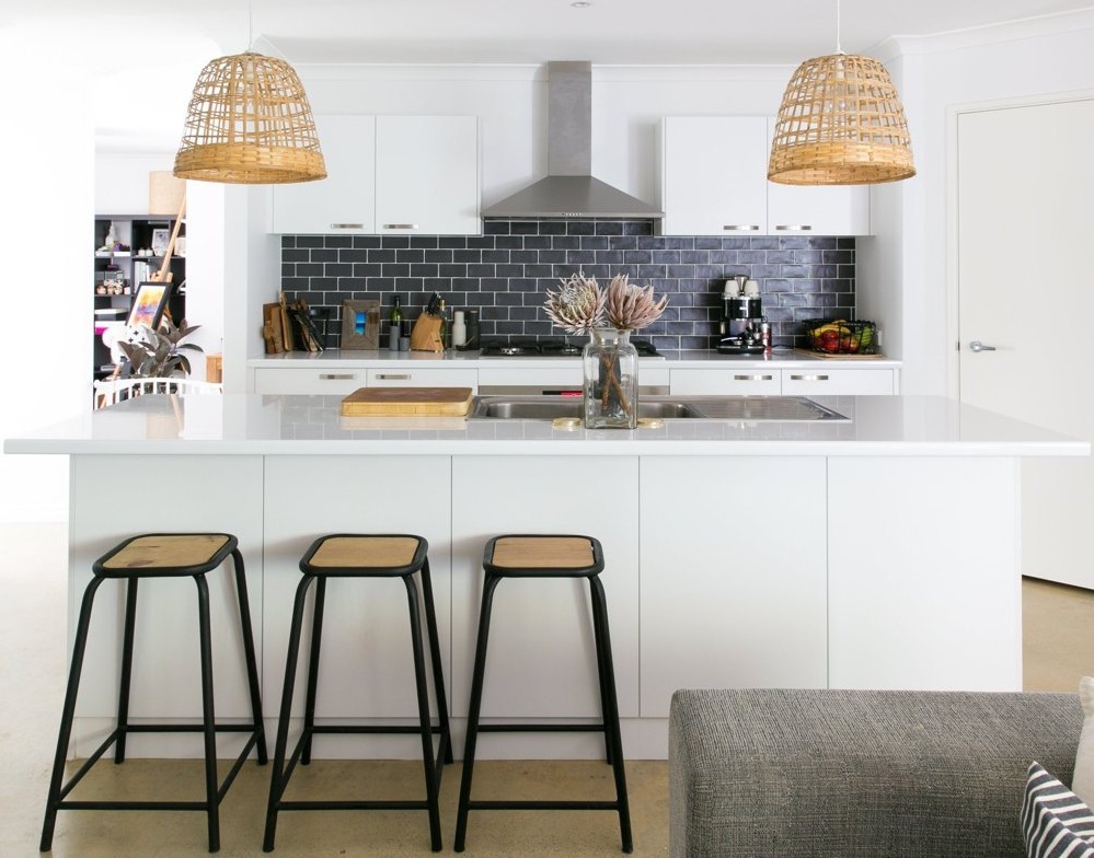 Căn hộ này nằm ở Tây Úc, chủ nhân là cặp vợ chồng Bec - Tom cùng những cô con gái của họ. Nằm trên thiết kế mở liên thông với phòng khách, căn bếp đảo này này được thực hiện theo ý tưởng của người vợ. Nó là sự kết hợp giữa nét hiện đại pha lẫn cổ điển truyền thống. Nội thất, trang thiết bị tiện nghi, kết hợp với backsplash là hình ảnh những viên gạch đen nổi bật trên nền trắng.