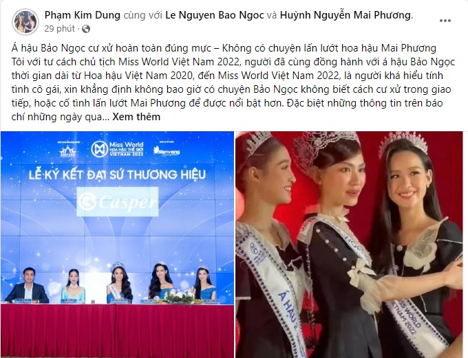 Để những ồn ào không đi quá xa, mới đây, "bà trùm Hoa hậu" Phạm Kim Dung - đại diện đơn vị chủ quản của cả hai đã lên tiếng phân bua rõ ràng. Trong bài viết dài đăng tài trên trang cá nhân, CEO Sen Vàng ở đầu bằng lời khẳng định: "Á hậu Bảo Ngọc cư xử hoàn toàn đúng mực - Không có chuyện lấn lướt Hoa hậu Mai Phương".