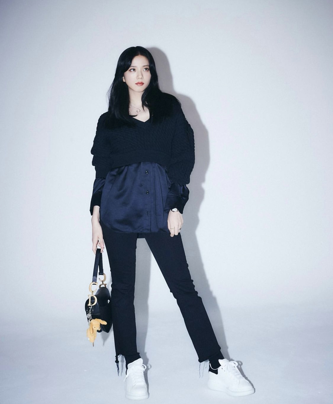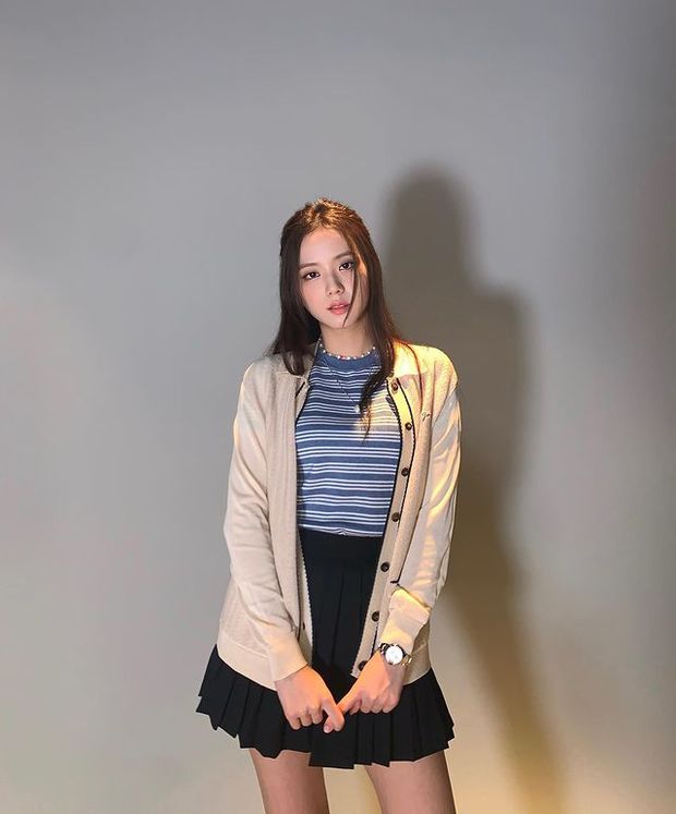 Để giấu nhẹm vòng eo kém thon, những outfit của Jisoo luôn có sự góp mặt của những chiếc áo khoác. Cô nàng thường chọn áo cardigan hoặc áo len mỏng để làm layer ngoài cùng. Như vậy, bạn vừa có thể tự tin mặc đồ tôn dáng mà khuyết điểm eo thô cũng giảm bớt đi.