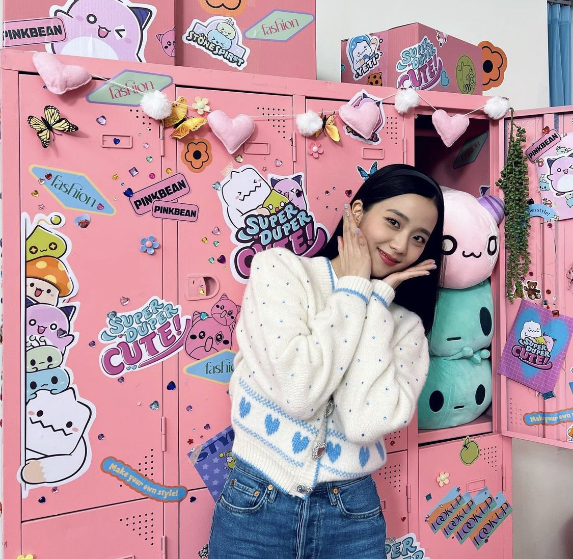 "Chị cả" BLACKPINK cũng yêu thích combo áo cardigan và quần jeans cạp cao. Lựa chọn những chiếc áo màu sắc giúp vẻ ngoài của cô nàng năng động trẻ trung hơn. Chất liệu dày dặn của áo len cũng giúp cô nàng khéo léo che đi nhược điểm "em bé mỡ".