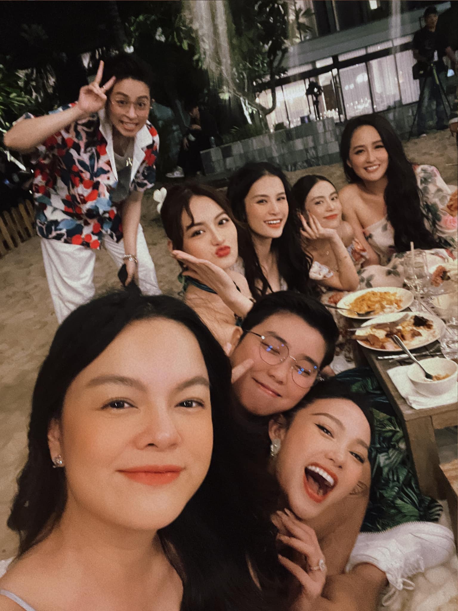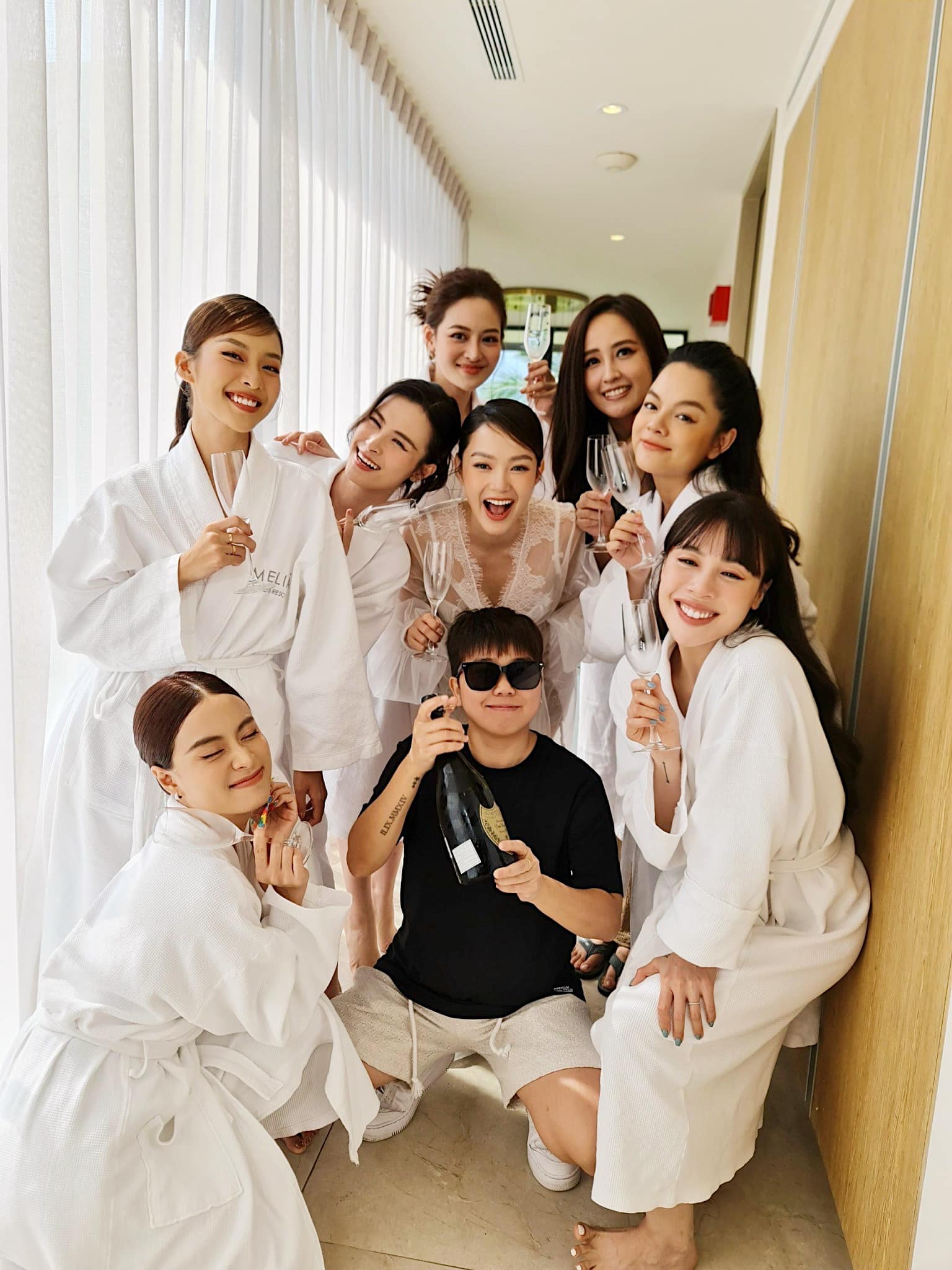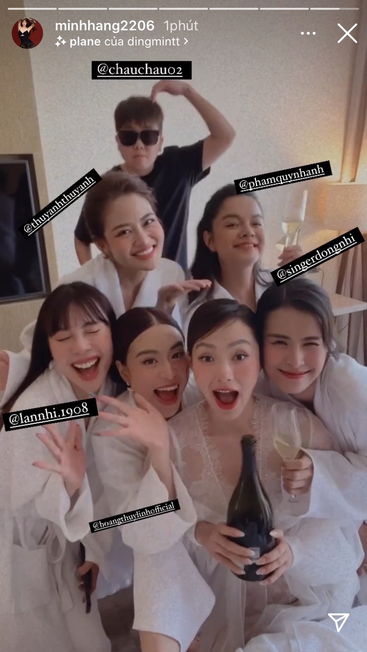 Cụ thể, trên story trang cá nhân, giọng ca Một vòng trái đất xinh đẹp rạng rỡ trước giờ G cùng hội bạn thân thiết như: Đông Nhi, Hoàng Thùy Linh, Phạm Quỳnh Anh... Có vẻ như cả nhóm đều đã chỉn chu xong phần make-up. Đáng chú ý, cô dâu cùng hội bạn của mình còn nhâm nhi chút rượu vang trước khoảnh khắc hôn lễ chính thức diễn ra.