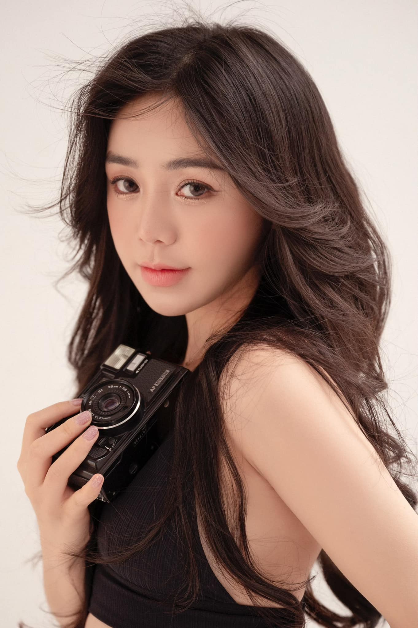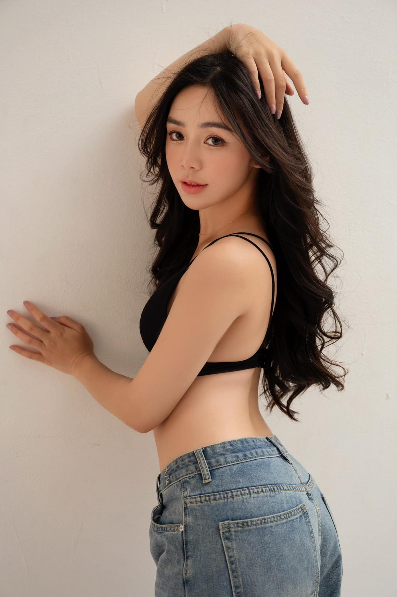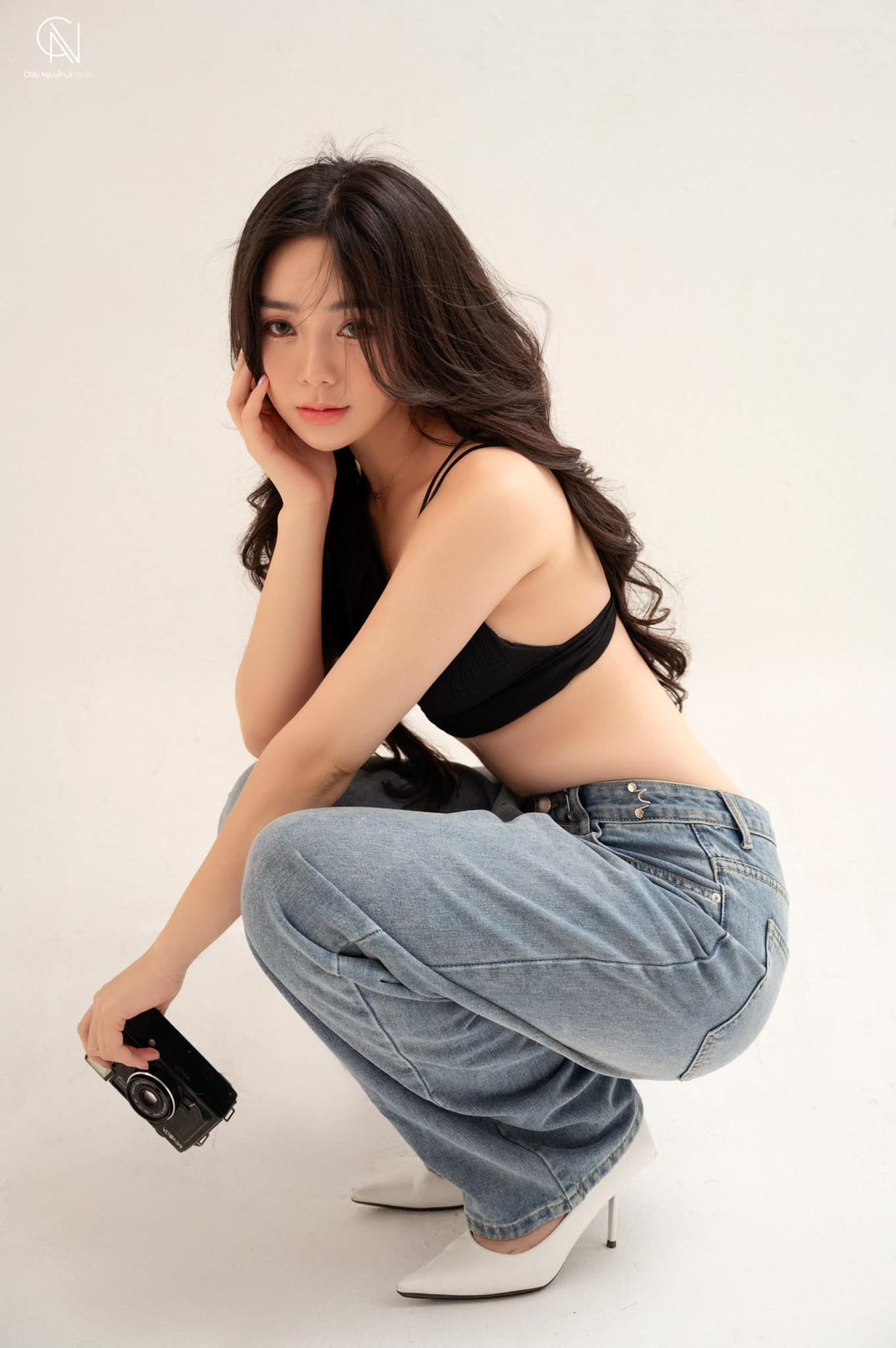 Trong loạt ảnh, Quỳnh Kool diện nội y đen kết hợp với quần jeans, khoe đường cong nóng bỏng cùng vòng eo thon thả. Mái tóc xoăn bồng bềnh cùng phong cách trang điểm tông cam hồng ngọt ngào cũng giúp cô trở nên trẻ trung, xinh đẹp hơn trông thấy.