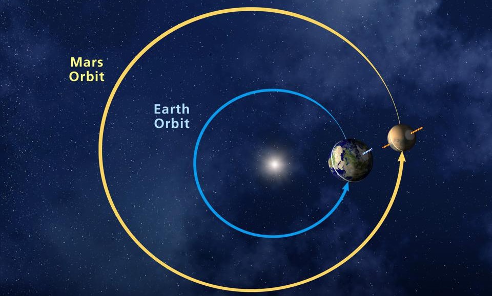 Hỏa tinh là hành tinh có quỹ đạo hình elip. Để đi hết một vòng quanh mặt trời, Hỏa tinh phải mất 687 ngày. Còn Trái Đất có quỹ đạo hình gần tròn, mất 365 ngày hoàn thành một vòng quay quanh mặt trời. Như vậy, cách 780 ngày hai hành tinh mới đi qua nhau. Cả hai khi quay quanh Mặt Trời cũng có hướng, tốc độ, khoảng cách khác nhau.