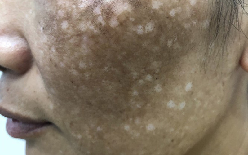 Mới đây, Viện cũng điều trị một bệnh nhân nữ, ngoài 30 tuổi, gặp biến chứng sau 6 tháng sử dụng kem trộn làm trắng da mua trên mạng. Da mặt bệnh nhân bị đốm đen trắng như cái bánh đa vừng, da mỏng, ngứa, mạch máu nổi rõ trên gương mặt. Bác sĩ tiên lượng việc điều trị sẽ kéo dài từ 6 tháng đến một năm để khắc phục hậu quả do kem trộn gây ra.