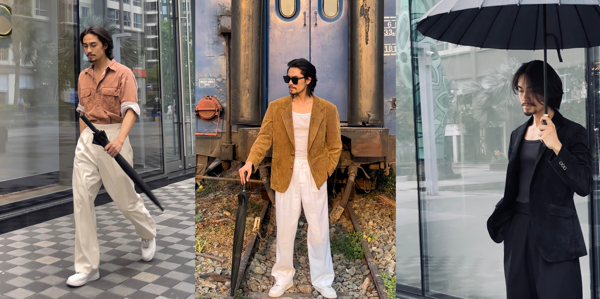 "Người tình màn ảnh" của Phương Thanh thường xuất hiện lịch lãm trong những bộ suit tông màu trung tính. Phụ kiện anh chàng yêu thích là kính râm và ô đen.