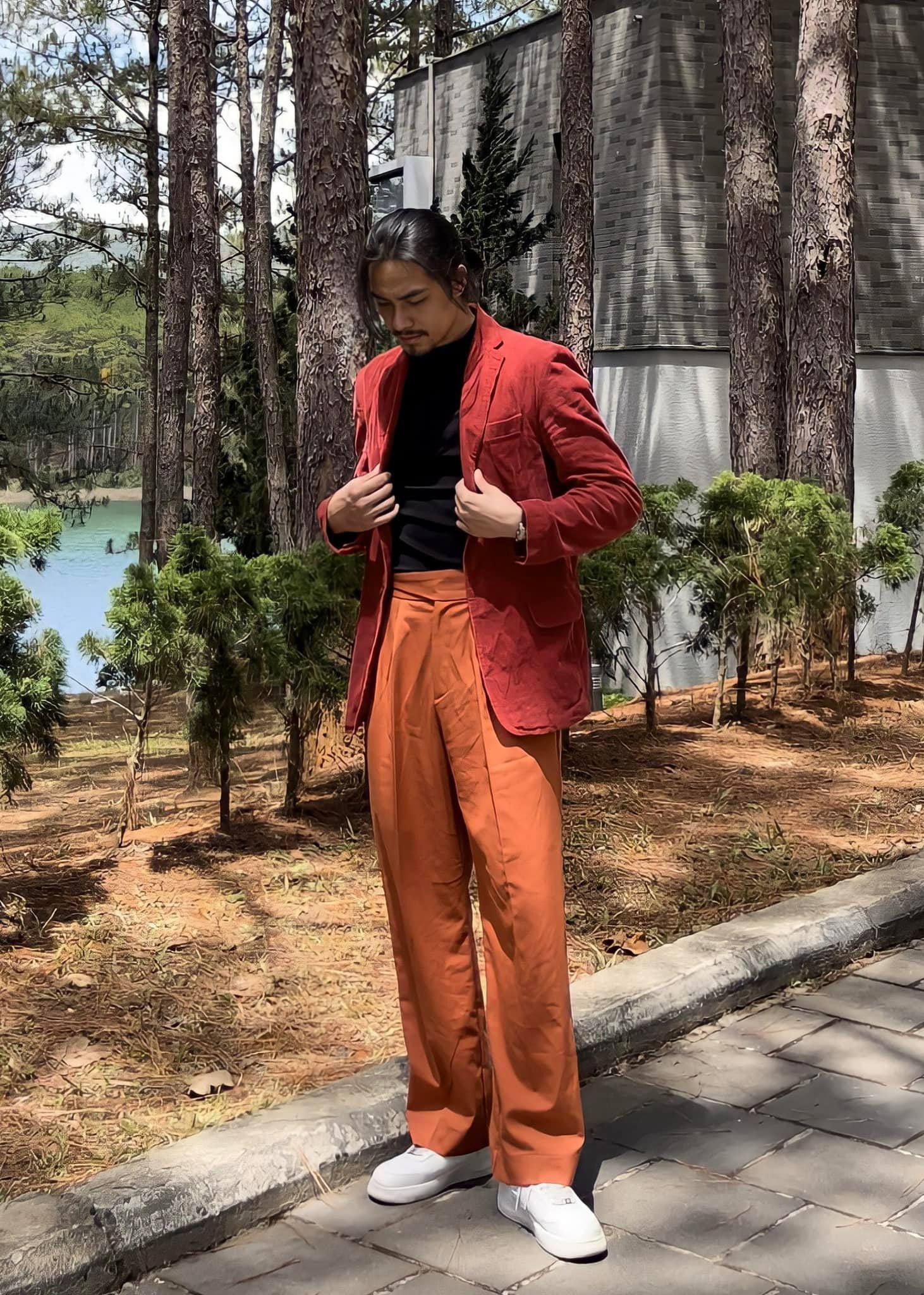 Doãn Chí Kiên gợi ý trang phục màu rực rỡ mà không chói lóa. Thực chất, anh chàng đã khéo léo cân bằng bộ trang phục màu cam, màu đỏ bằng áo thun cao cổ màu đen.