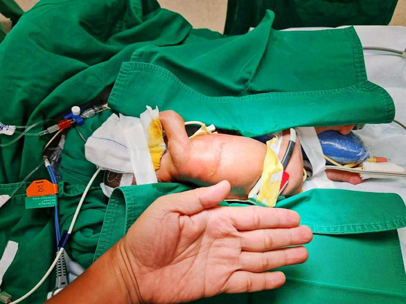 Khi được chuyển đến Bệnh viện Nhi đồng Thành phố ngày 7/8, bé chỉ mới hai ngày tuổi, sinh non ở tuần thai 32. Trước đó mẹ khám thai định kỳ đều không ghi nhận thai nhi bất thường.