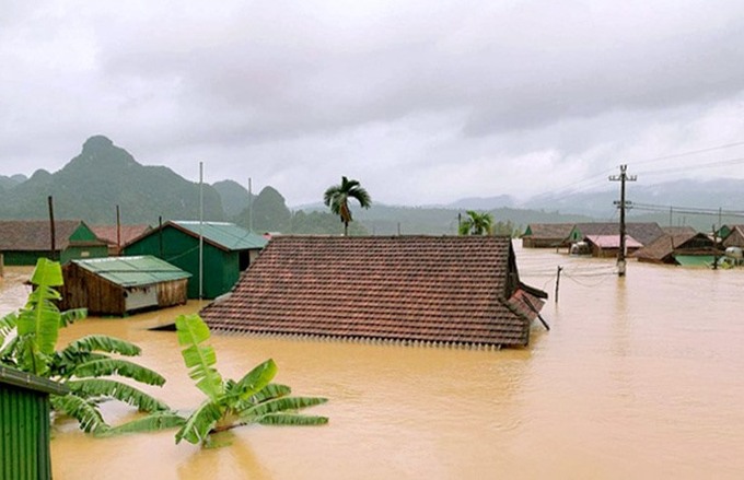 Do mưa lớn nhiều ngày liên tục, phần lớn diện tích xã Tân Hóa, huyện Tuyên Hóa, tỉnh Quảng Bình bị nước lũ dâng chạm nóc nhà, hàng loạt công trình tại xã chìm trong biển nước, địa bàn chia cắt cục bộ.