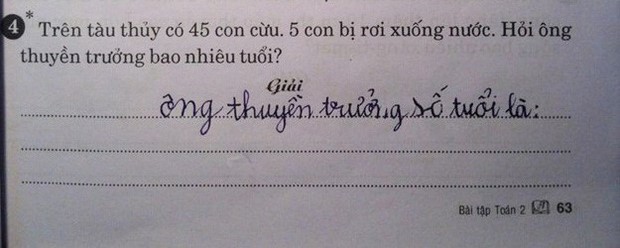 Cụ thể đề bài toán là: "Trên tàu thủy có 45 con cừu. 5 con bị rơi xuống nước. Hỏi ông thuyền trưởng bao nhiêu tuổi?".
