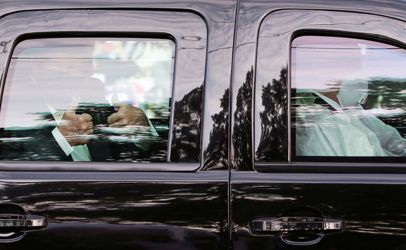 Khi thấy Donald Trump xuất hiện trong chiếc xe SUV chống đạn, người ủng hộ đã hò reo nhiệt tình. Trong xe, ông Donald Trump có đeo khẩu trang và vẫy chào mọi người.