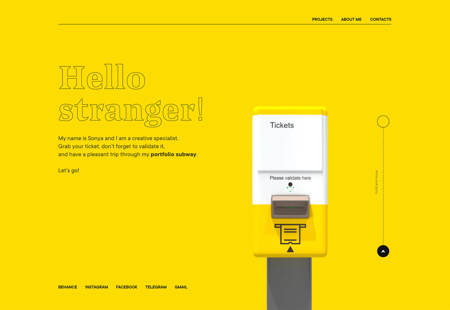 Sonya Mudvex sử dụng toàn bộ nền màu vàng trên trang chủ của mình. Phần còn lại của thiết kế có nền màu xám nhẹ và nhiều điểm nhấn màu vàng. Ngoài việc sử dụng màu sắc tuyệt vời ở đây, có rất nhiều thủ thuật UX khác được sử dụng, bao gồm một số công cụ định vị nếu bạn tương tác với hình ảnh xác thực vé trên màn hình.